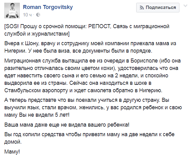 Пожилую женщину из Нигерии, которая прилетела к своему сыну, 16 августа не пропустили на таможне в аэропорту "Борисполь".