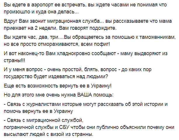 "Я пытался получить хоть какое-то подтверждение от пограничников, в случае, когда она прилетит снова, ее все-таки пустят. Мне никто ничего не обещает. Там говорят, что нет смысла обещать, если у нее есть паспорт, виза и т.д., ее впустят. Уже один раз пустили (ирон.)", - рассказал сотрудник Шона Роман.