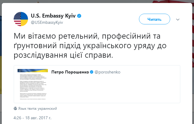 "Мы приветствуем тщательный профессиональный и основательный подход украинского правительства к расследованию этого дела", - говорится в сообщении со ссылкой на заявление Порошенко от 16 августа, где он говорит о расследовании.