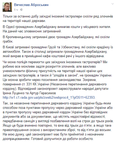 Заместитель главы Нацполиции Вячеслав Аброськин пожаловался в Facebook, что только за последние сутки полиция изъяла тысячу патронов и несколько гранат по всей Украине.
