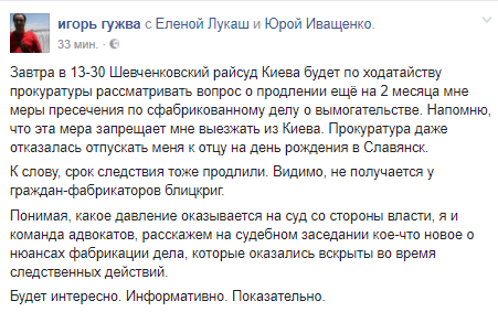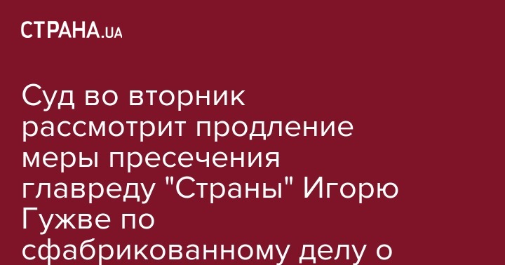 Во вторник, 22 августа, в Шевченковском райсуде Киева состоится слушание по ходатайству прокуратуры о продлении на 2 месяца меры пресечения по сфабрикованному делу о вымогательстве в отношении главного редактора интернет-газеты "Страна.ua" Игоря Гужвы. Об этом он сообщил на своей странице в Facebook.