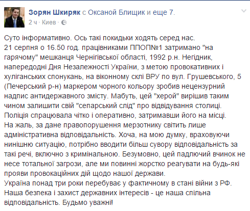 По словам Шкиряка, в понедельник в 16:50 работники полка полиции особого назначения №1 задержали 25-летнего жителя Черниговской области, который из провокационных и хулиганских побуждений, маркером черного цвета сделал нецензурную надпись антигосударственного содержания на оконном стекле здания Верховной Рады.