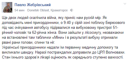 "В 09.40 в "серой зоне" вблизи Березового во время ожидания автобуса подорвались на взрывном устройстве 51-летний мужчина и 62-летняя женщина. Они зашли в лесополосу, несмотря на установленные там таблички "Мины" и в результате взрыва получили рваные раны головы, спины и ног. Украинские пограничники оказали им первую медицинскую помощь и вызвали скорую", - написал Жебривский.