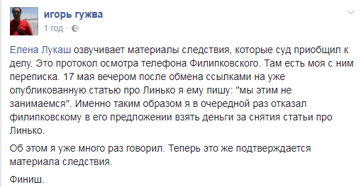 "Елена Лукаш озвучивает материалы следствия, которые суд приобщил к делу. Это протокол осмотра телефона Филипковского. Там есть моя с ним переписка. 17 мая вечером после обмена ссылками на уже опубликованную статью про Линько я ему пишу: "мы этим не занимаемся". Именно таким образом я в очередной раз отказал филипковскому в его предложении взять деньги за снятия статьи про Линько.