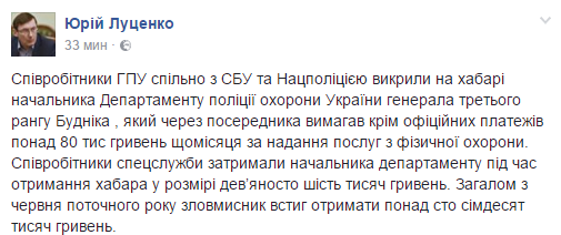 "Сотрудники ГПУ совместно с СБУ и Нацполицией разоблачили на взятке начальника Департамента полиции охраны Украины генерала третьего ранга Будника, который через посредника требовал кроме официальных платежей более 80 тыс грн ежемесячно за предоставление услуг по физической охране", – написал он на своей странице в Facebook во вторник вечером.