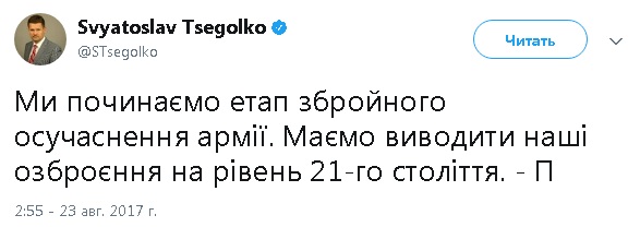 Президент Петр Порошенко заявил о начале этапа осовременивании армии и вывода вооружений на новый уровень. Об этом глава заявил в ходе открытия выставки вооружения и военной техники на улице Крещатик в Киеве, пишет его пресс-секретарь Святослав Цеголко в Twitter.