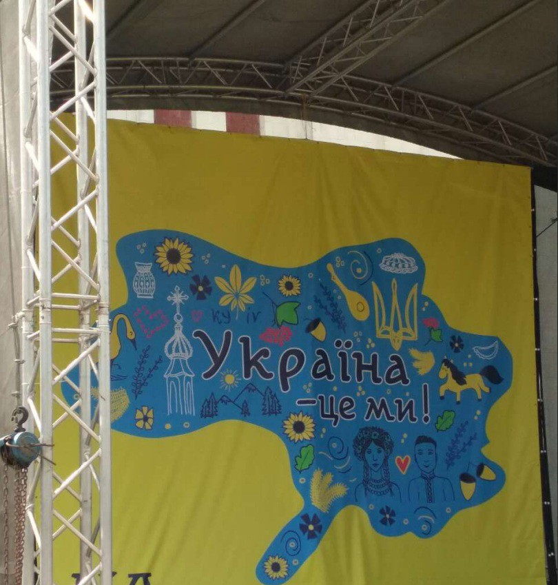На баннере на сцене изображена карта Украины, но без оккупированного Крыма, а восточная граница проходит по линии разграничения сторон в зоне АТО.