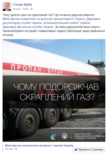 Первый вице-премьер-министр экономического развития и торговли Степан Кубив поручил Министерству энергетики и угольной промышленности, Государственной регуляторной службе, Государственной фискальной службе (ГФС) и Антимонопольному комитету Украины (АМКУ) изучить причины подорожания сжиженного газа. Об этом он написал на своей странице в соцсети Facebook.