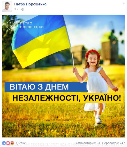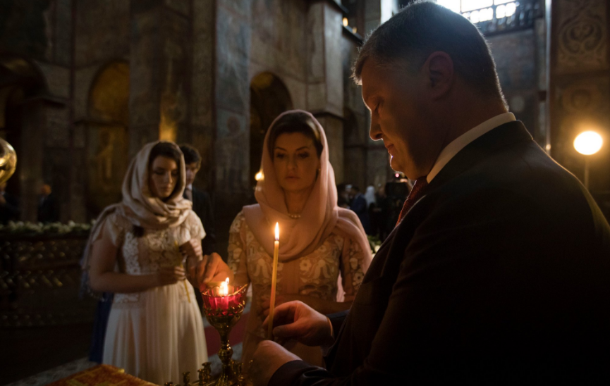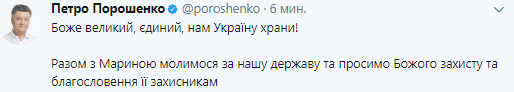 "Боже великий, единый, нам Украину храни! Вместе с Мариной молимся за нашу страну и просим Божьего защиты и благословения ее защитникам", - сообщается в Twitter президента.