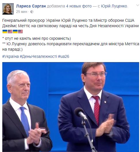 12:23  Спикер Генпрокурора Лариса Сарган рассказала, что Юрий Луценко сегодня работал у главы Пентагона Джеймса Мэттиса переводчиком.