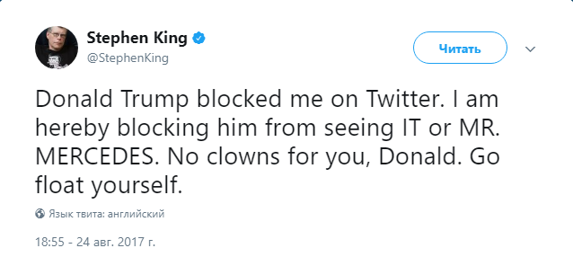 "Дональд Трамп заблокировал меня в Twitter. Я, таким образом, блокирую его от просмотра "Оно" и "Мистера Мерседеса". Никаких вам клоунов, Дональд", – заявил Кинг.