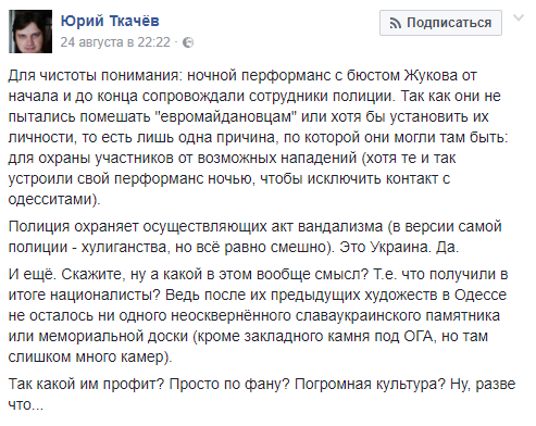"Ночной перформанс с бюстом Жукова от начала и до конца сопровождали сотрудники полиции. Так как они не пытались помешать "евромайдановцам" или хотя бы установить их личности, то есть лишь одна причина, по которой они могли там быть: для охраны участников от возможных нападений (хотя те и так устроили свой перформанс ночью, чтобы исключить контакт с одесситами)," - пишет журналист Юрий Ткачев у себя в Facebook.