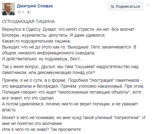 "Вернулся в Одессу. Думал, что кипят страсти. Ан нет. Все молчат. Блогеры, журналисты, депутаты. Я даже удивился. Какая-то подозрительная тишина. Выходит, что не до этого как-то. Выходные. Лето заканчивается. В общем, никакого информационного скандала. И действительно, ну подумаешь, бюст... Так у меня вопрос, друзья: мы таки "скушаем" надругательство над памятником, или декоммунизация понад усе?", - недоумевает одесский общественный деятель Дмитрий Спивак.