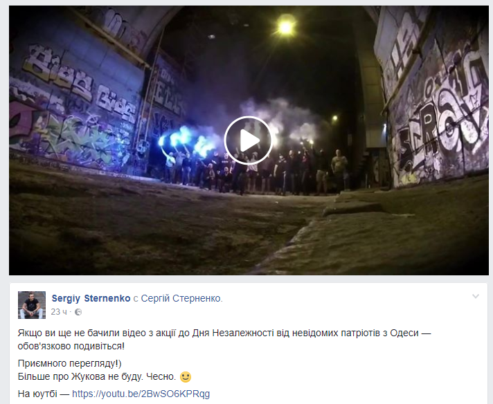 "Если вы не видели видео с акции к Дню независимости от неизвестных патриотов из Одессы - обязательно посмотрите! Приятного просмотра! Больше про Жукова не буду. Честно", - написал экс-лидер одесского "Правого сектора" Сергей Стерненко.