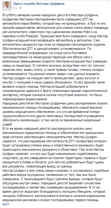 "Нестор Шуфрич не покидал место происшествия, сразу вступил в контакт с полицией и начал давать объяснения, - говорится в заявлении. - По его просьбе также вызвали скорую помощь. Нестор-младший добровольно в сопровождении адвоката и брата Александра прошел наркологическую экспертизу, которая показала полное отсутствие алкоголя, что было зафиксировано видеосъемкой. Народным депутатом Нестором Шуфричем дано распоряжение оказать максимальную помощь пострадавшему, обеспечить самый высокий уровень медицинского обеспечения, а в случае временной потери трудоспособности или других негативных последствий случившегося обеспечить компенсацию, в том числе за принесенный моральный ущерб. В то же время народный депутат распорядился оказать сыну максимальную юридическую помощь в обеспечении его гражданских прав согласно действующего законодательства. Нестор Шуфрич надеется, что расследование обстоятельств ДТП, вследствие которого будет установлена степень вины и ответственности виновного, будет происходить максимально прозрачно и объективно. При этом Нестор Шуфрич заявляет, что его сын будет максимально содействовать следствию, до его завершения не покинет территорию Украины и будет находиться в Киеве и области, для чего им добровольно будут сданы все документы, позволяющие выезд за границу. Нестор Шуфрич и все члены семьи сожалеют о случившемся, подобные действия всегда осуждались, независимо от того, кем они были совершены. С происшедшего будут сделаны выводы, которые будут обсуждены внутри семьи".