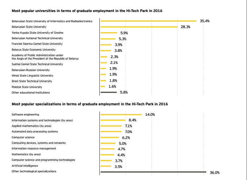 В Беларуси 75 тысяч студентов (24% от общего числа студентов ВУЗов) учатся на STEM-специальностях, включая около 70 ИТ-специализаций. На долю окончивших БГУИР приходится 35,4% сотрудников компаний-резидентов ПВТ.