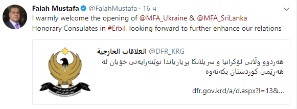 "С теплотой приветствую открытие почетных консульств МИД Украины и МИД Шри-Ланки в Эрбиле, ожидаю дальнейшего улучшения наших отношений", - написал Ф.Мустафа.