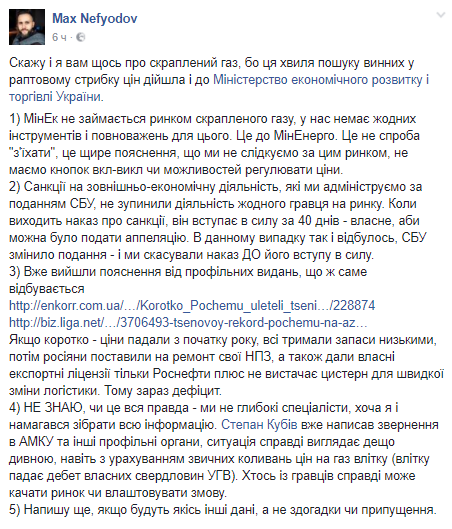 "Скажу и я вам что-то о сжиженном газе, потому что эта волна поиска виновных во внезапном скачке цен дошла и до Министерства экономического развития и торговли. Минэкономики не занимается рынком сжиженного газа, у нас нет никаких инструментов и полномочий для этого. Это в Минэнерго. Это не попытка "съехать", это искреннее объяснение, что мы не следим за этим рынком, не имеем кнопок вкл-выкл или возможностей регулировать цены. Санкции на внешнеэкономическую деятельность, которые мы администрируем по представлению СБУ, не остановили деятельность ни одного игрока на рынке", - написал Нефедов.