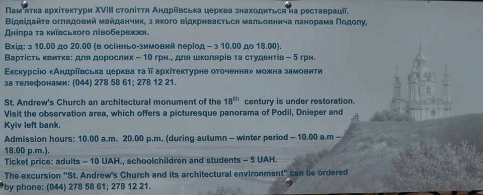 В пресс-службе музея "Андреевская церковь" появление платного входа объяснили тем, что на реставрацию церкви пришлось потратить значительную сумму бюджетных средств. Четыре миллиона гривен пришлось оплатить ремонтные работы церкви.