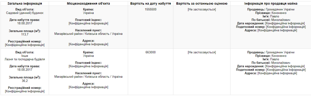 Приобретение было задекларировано 18 августа этого года. При этом продавцом недвижимости Кононенко указал себя.