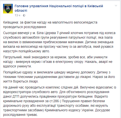 В Белой Церкви под Киевом вчера вечером, 28 августа, сотрудник патрульной полиции за рулем служебного авто сбил 7-летнего велосипедиста. Об этом сообщает пресс-служба областной полиции.