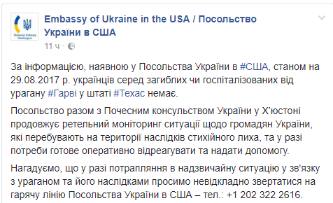 "По информации, имеющейся у посольства Украины в США, по состоянию на 29.08.2017 года украинцев среди погибших или госпитализированных от урагана Харви в штате Техас нет", - говорится в сообщении.