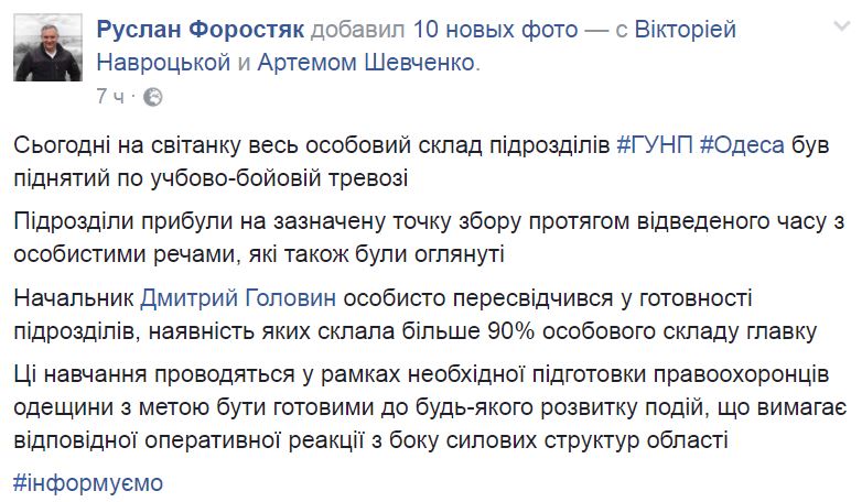 Стоит отметить, что спустя несколько часов Головин удалил пост в соцсети. Однако об учениях написал советник главы Нацполиции Одесской области Руслан Форостяк.