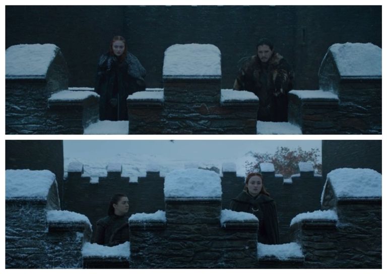 Эта сцена в финальном сезоне визуально повторяет сцену из прошлого сезона, где Санса и Джон, стоя на том же самом месте, говорят о том, что нельзя доверять Мизинцу. Оба разговора посвящены тому, что необходимо объединиться, чтобы побороть обстоятельства. Похоже, что эта крыша помогает Старкам держаться вместе.