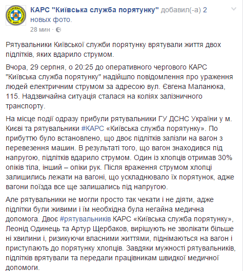 На место происшествия сразу прибыли спасатели ГУ ГосЧС Украины в Киеве и спасатели "Киевской службы спасения". Оказалось, что двое подростков залезли на вагон по перевозке машин. Их ударило током, поскольку вагон находился под напряжением. Один из ребят получил 30% ожогов тела, другой – ожоги рук.