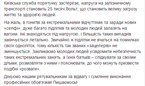 Киевская служба спасения предупреждает, что напряжение на железнодорожном транспорте составляет 25 тыс. вольт, что представляет большую угрозу жизни и здоровью людей.