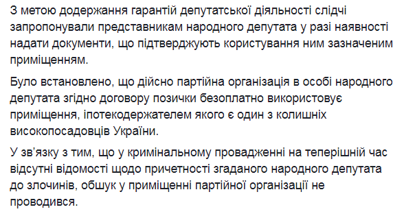 "В связи с тем, что в уголовном производстве в настоящее время отсутствуют сведения о причастности упомянутого народного депутата к преступлениям, обыск в помещении партийной организации не проводился", - сообщили в Генпрокуратуре.