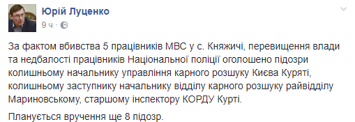 По факту убийства пяти работников МВД в с. Княжичи, превышению власти и халатности работников Национальной полиции объявлены подозрения бывшему начальнику управления уголовного розыска Киева Леониду Куряте, бывшему заместителю начальника отдела уголовного розыска райотдела Роману Мариновскому и старшему инспектору КОРДа Андрею Курте.