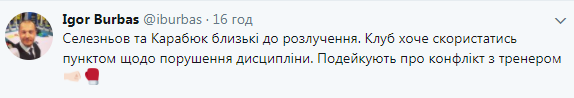 "Селезнев и "Карабюкспор" близки к расставанию. Клуб хочет воспользоваться пунктом о нарушении дисциплины. Говорят о конфликте с тренером", - написал Бурбас.