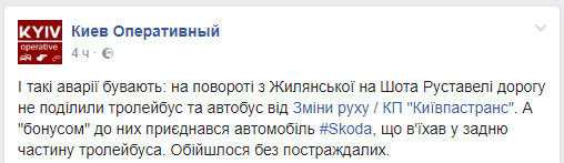 В центре Киева на повороте с Жилянской на Шота Руставели столкнулись троллейбус и автобус. Об этом сообщает "Киев Оперативный" в Facebook.