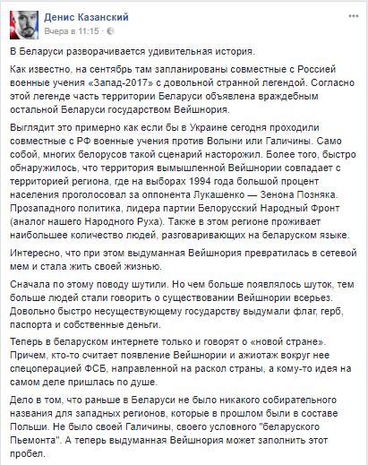 "Сначала по этому поводу шутили. Но чем больше появлялось шуток, тем больше людей стали говорить о существовании Вейшнории всерьез ... Дело в том, что раньше в Беларуси не было никакого собирательного названия для западных регионов, которые в прошлом были в составе Польши. Не было своей Галичины, своего условного "беларуского Пьемонта". А теперь выдуманная Вейшнория может заполнить этот пробел", - написал Казанский у себя Facebook.