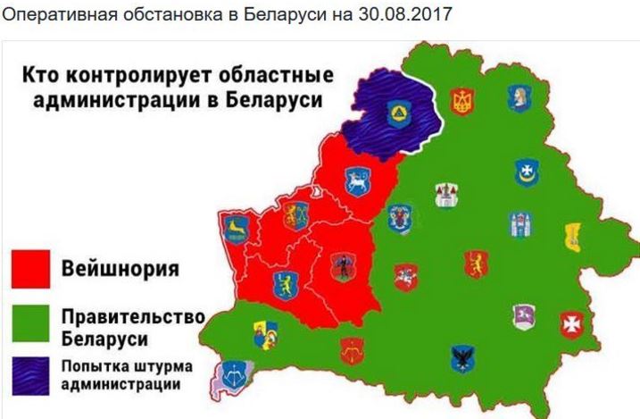 Белорусских оппозиционеров Вейшнория сразу заинтересовала. На штабной карте она совпала с северо-западом Беларуси, население которого менее довольно (или, можно сказать, более недовольно) Александром Лукашенко, чем остальные регионы страны. Тут живут преимущественно этнические поляки и католики. Хотя различия в политических предпочтения между этим регионов и восточными областями респулики, естественно, не такие сильные как между Галичиной и Донбассом в Украине. Скорее, как между Донбассом и Харьковской областью.