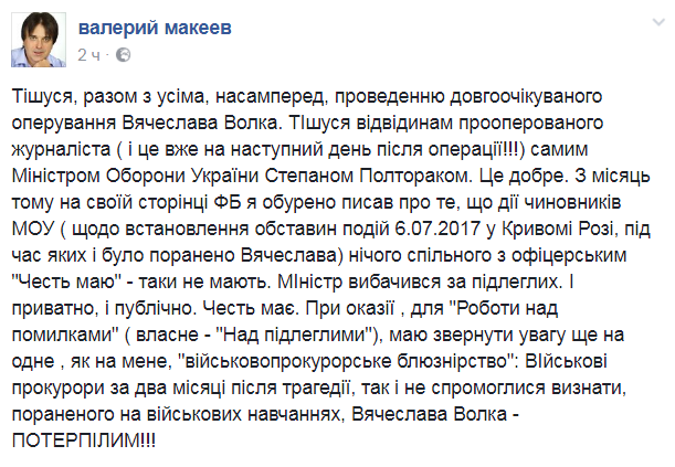 "Рад, вместе со всеми, прежде всего, проведению долгожданного оперирования Вячеслава Волка. Рад посещению прооперированного журналиста (и это уже на следующий день после операции !!!) самим Министром обороны Украины Степаном Полторак. Это хорошо.", - отметил блогер.