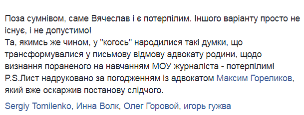P.S. Письмо напечатано по согласованию с адвокатом Максимом Гореликовым, который уже обжаловал постановление следователя (о непризнании раненого журналиста потерпевшим - прим.)". - отметил неравнодушный блогер.