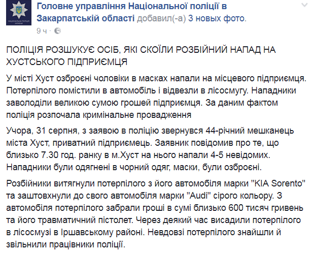 "Разбойники вытащили потерпевшего из его автомобиля марки KIA Sorento и втолкнули в свой автомобиль Аudi серого цвета. Из автомобиля потерпевшего забрали деньги в сумме около 600 тыс. грн и его травматический пистолет. Через некоторое время потерпевшего высадили в лесополосе в Иршавском районе (Закарпатья), где его нашли работники полиции", - говорится в сообщении.