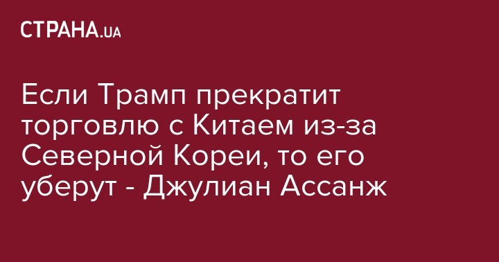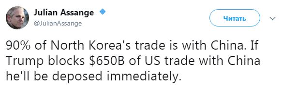 "90% торговли КНДР ведется с Китаем. Если Трамп перекроет торговлю США с Китаем в 650 млрд долларов, то будет немедленно смещен", - написал Ассанж.