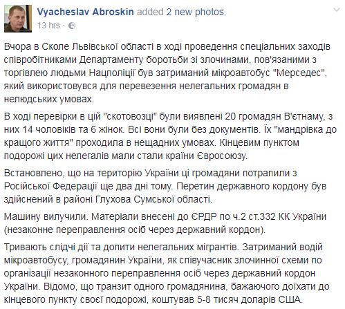 В городе Сколе Львовской области задержали микроавтобус, в котором нелегально перевозили 20 граждан Вьетнама. Об этом сообщил замглавы Национальной полиции Вячеслав Аброськин на своей странице в Facebook.