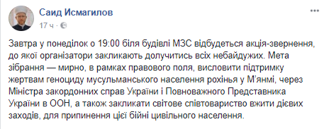"В понедельник в 19:00 у здания МИД состоится акция-обращение, в которой организаторы призывают присоединиться всех неравнодушных. Цель собрания - мирно, в рамках правового поля, выразить поддержку жертвам геноцида мусульманского населения рохинджа в Мьянме, через министра иностранных дел Украины и полномочного представителя Украины в ООН, а также призвать мировое сообщество принять действенные меры для прекращения этой бойни гражданского населения", - отметил Исмагилов.