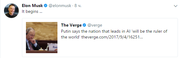 "Началось... Китай, Россия, а потом и все страны, которые сильны в компьютерных науках. Конкуренция за превосходство в сфере искусственного интеллекта на национальном уровне – наиболее вероятная причина начала Третьей мировой войны", – написал он в Twitter.