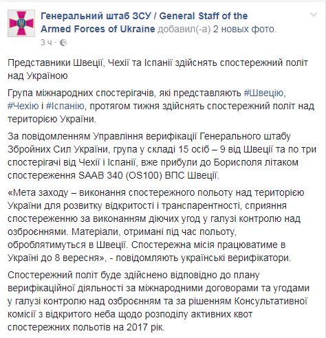 Наблюдатели из Швеции, Чехии и Испании в течение недели проведут полеты над территорией Украины. Об этом сообщает пресс-служба Генерального штаба ВСУ в Facebook.