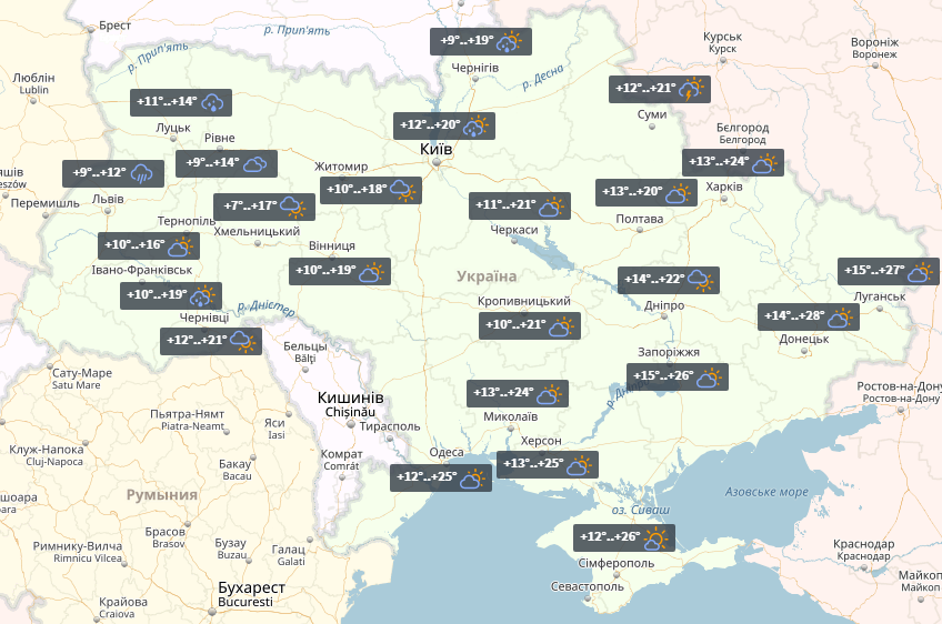 Подобный данные о погоде предоставляет и Укргидромет. Как видно по погодной карте, гидрометеорогический центр Украины также прогнозирует дожди на западе страны и сухую погоду в центре и на востоке.