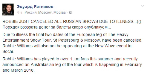 Менеджер пояснил, что причиной стала болезнь музыканта. К слову, кроме сольного концерта в российской столице у Робби был запланирован визит на музыкальный конкурс "Новая волна", который также не состоится.