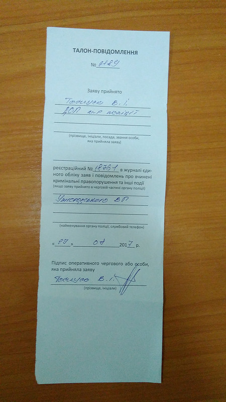 На фото талоны-уведомления, которые выдают в полиции после того как написали заявление о преступлении. Судя по всему, в ЕРДР это дело не внесли, а заявлений было два - от переселенца и от адвоката (о препятствовании адвокатской деятельности).