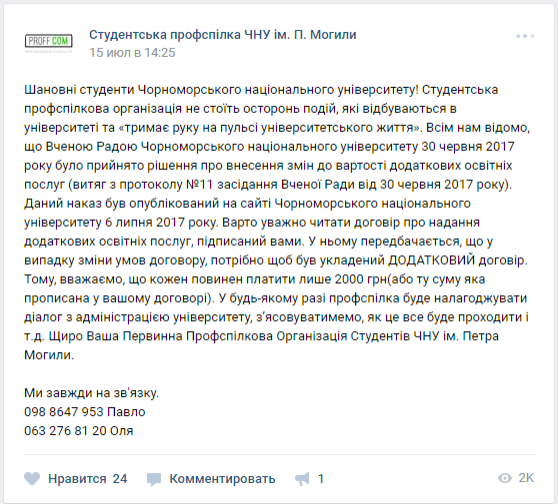 "Всем нам известно, что Ученым Советом Черноморского национального университета 30 июня 2017 было принято решение о внесении изменений в стоимости дополнительных образовательных услуг (выписка из протокола №11 заседания Ученого Совета от 30 июня 2017 года). Данный приказ был опубликован на сайте Черноморского национального университета 6 июля 2017. Стоит внимательно читать договор о предоставлении дополнительных образовательных услуг, подписанный вами. В нем предусматривается, что в случае изменения условий договора, нужно чтобы был заключен дополнительный договор. Поэтому, считаем, что каждый должен платить только 2000 грн (или ту сумму, которая прописана в вашем договоре)", - обращается профсоюз.