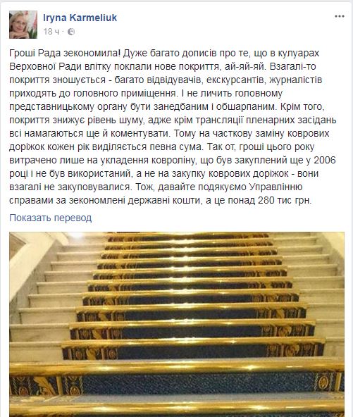 "Деньги Рада сэкономила! Очень много сообщений о том, что в кулуарах Верховной Рады летом положили новое покрытие, ай-яй-яй. Вообще-то покрытие изнашивается - много посетителей, экскурсантов, журналистов приходят к главного помещения. И не подобает главному представительному органу быть заброшенным и обшарпаним... Поэтому на частичную замену ковровых дорожек каждый год выделяется определенная сумма. Так вот, деньги этого года потрачено только на укладку ковролина, который был закуплен еще в 2006 году и не был использован, а не на закупку ковровых дорожек - они вообще не закупались", - написала она.