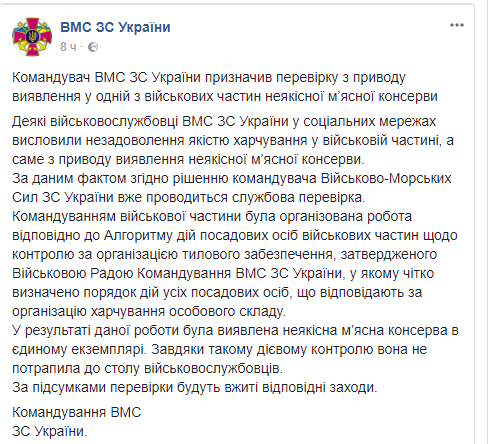 В пресс-службе ВСУ заявили, что по данному факту будет проведена служебная проверка. "Некоторые военнослужащие ВМС ВС Украины в социальных сетях выразили недовольство качеством питания в воинской части, а именно по поводу выявления некачественной мясной консервы. По данному факту согласно решению командующего Военно-Морских Сил ВС Украины уже проводится служебная проверка", - отметили в ВМС.